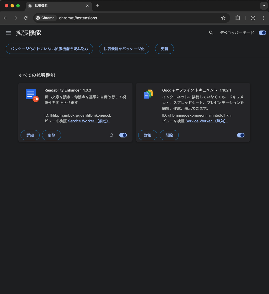 chrome://extensionsと入力して開く - 右上の「デベロッパーモード」をオンにする