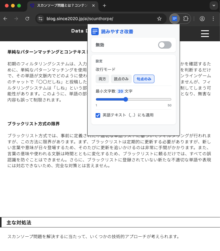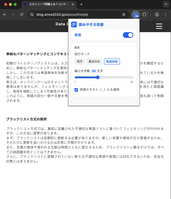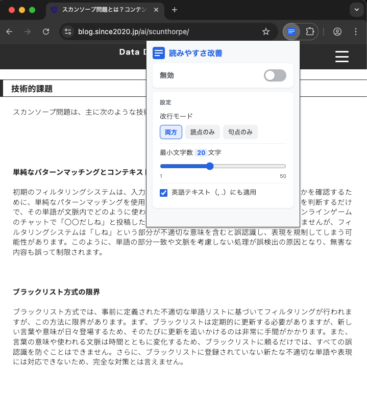 設定は chrome.storage.sync に保存されるため、ブラウザを閉じても次回以降に引き継がれます。英語記事を読む機会が多い方は「英語テキストにも適用」をONにすると効果的です。
