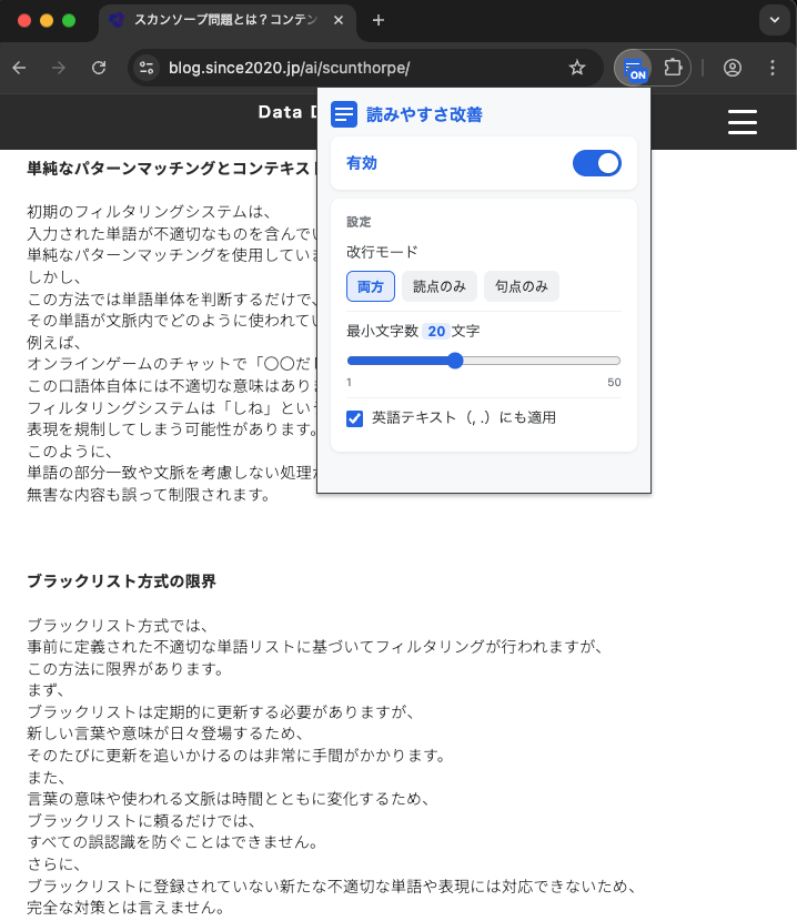 「読みやすくなる」と断言できる根拠はまだ持っていません。あくまで仮説を手元で試すための環境づくりです。ページのデザインを大きく崩してしまうと比較が難しくなるため、「元のページはそのまま、テキストにだけ手を加える」という非破壊なアプローチを選びました。