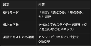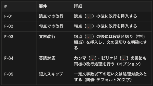 文節や句読点での改行が読みやすさに影響するという研究はあるようですが、今回はそこまで深追いせず、まずは動くものを作って自分で試す、という方針で進めました。あわせて、Claude Codeにどこまで任せられるかも確認する機会にしました。
