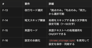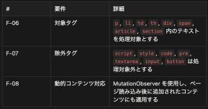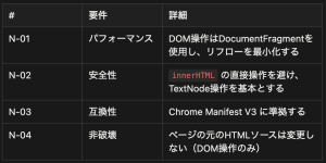 自分でゼロから書くとかなりの時間がかかる量です。Manifest V3対応やMutationObserverの指定など、Chrome拡張機能の実装知識が必要な部分まで含まれていました。