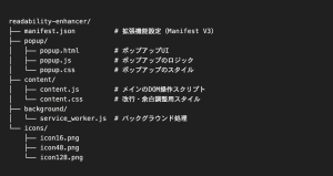 この構成をそのまま chrome.md(要件定義書)として保存し、「この要件定義をもとに実装してください」と指示した結果、各ファイルをすべて生成してくれました。アイコンはPNGバイナリを直接生成できないため、Pythonスクリプト(generate_icons.py)を出力して実行する形で対応しています。