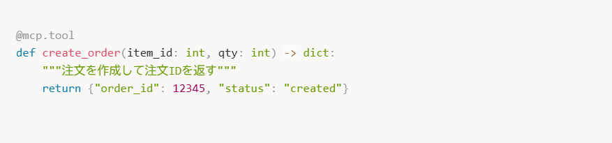 Python関数に @mcp.tool デコレーターを適用するだけでツールになります。関数名がツール名となり、Docstringが説明として自動的に使用されます。