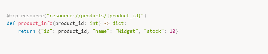 @mcp.resource デコレーターを使用し、一意のURI(例: "resource://greeting")を指定して定義します。