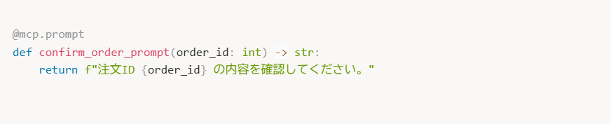 @mcp.prompt デコレーターをPython関数に適用します。関数名がプロンプトの識別子となります。
