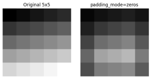 padding_modeという引数を指定することで、畳み込みの際に周辺のデータをどのように埋めるかを制御できます。公式のドキュメントでは、このパラメータに指定できるオプションが記載されていますが、その詳細や実際の挙動については明確にされていません。そこで、今回は padding_modeを変更し、簡易的な白黒画像に対して畳み込み処理を実行して、その挙動を観察していきます。