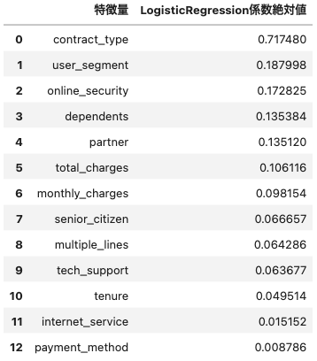 }).sort_values('LogisticRegression係数絶対値', ascending=False).reset_index(drop=True)