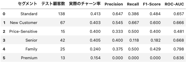 Logistic Regressionは契約形態・セグメントといった構造的要素を重視する傾向があります。また、Price-Sensitiveセグメントの予測精度(ROC-AUC 0.481)が低いことから、価格重視顧客の行動予測の困難さも確認されました。