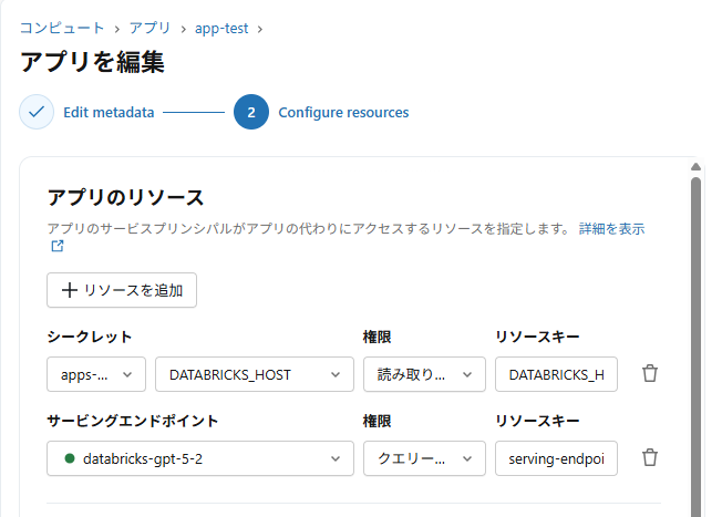 既存のDatabricks Appsのアプリ編集画面からサービスエンドポイントを追加します。この時、今回使用するサービスエンドポイントを「databricks-gpt-5-2」としてリソースキーを「serving-endpoint」とします。