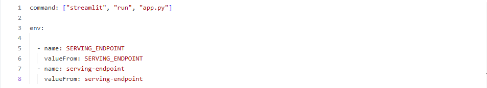 続いて,Apps上からエンドポイントにアクセスできるようにyamlファイルを編集します。以下のようにserving-endpointを追加します。これによりpythonファイル内で環境変数としてエンドポイントを利用できるようになります。