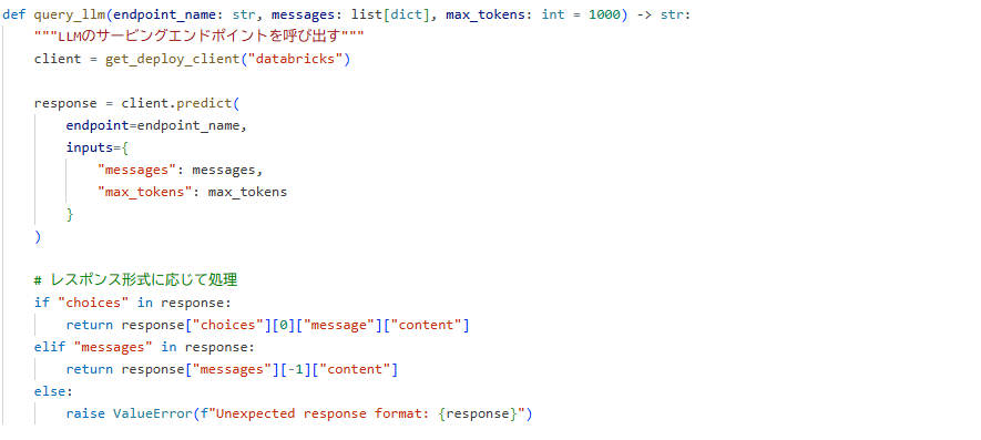 続いて、LLMのエンドポイントを呼び出す関数を構築します。
