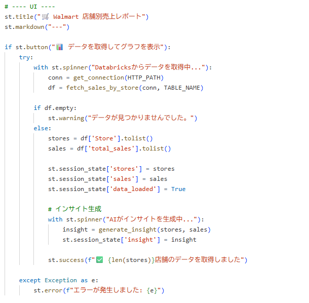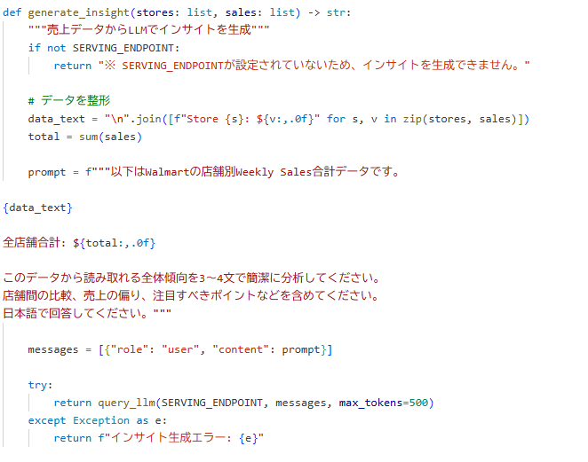 最後に、Databricks上から取得したデータをプロンプトに含め、LLMにリクエストを投げる関数を作成します。