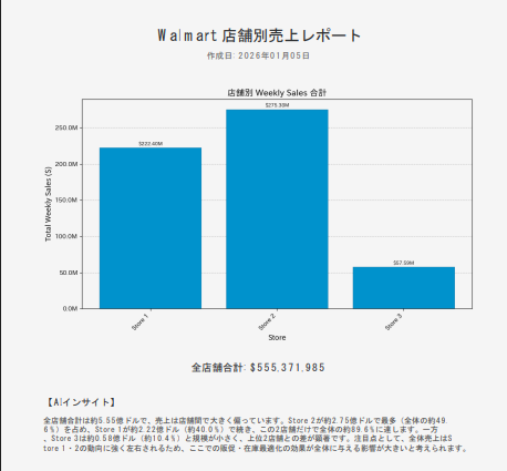 今回は他ブログで構築した、Walmartのデータを使用してPDFレポートを作成するアプリを使用します。現在のレポートではLLMによるインサイトがありませんが、モデルサービング経由でLLMを呼び出しインサイトを食えることを目的とします。