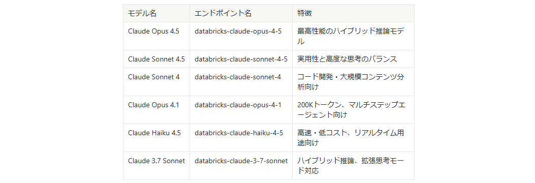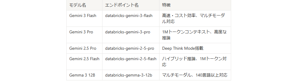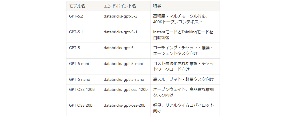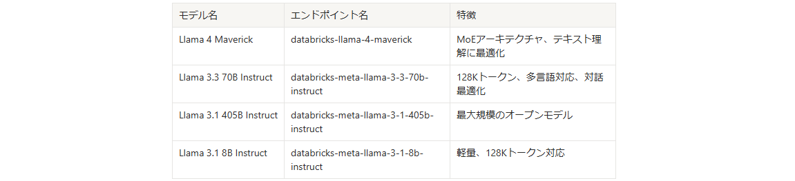 Databricks Model APIsで利用できる主なモデルを紹介します。これらはすべて事前構成されており、ワークスペースですぐに利用可能です。