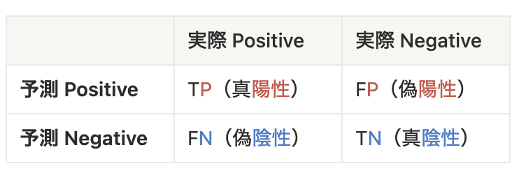 二値分類では、予測と実際の組み合わせを 混同行列(Confusion Matrix) に並べます。