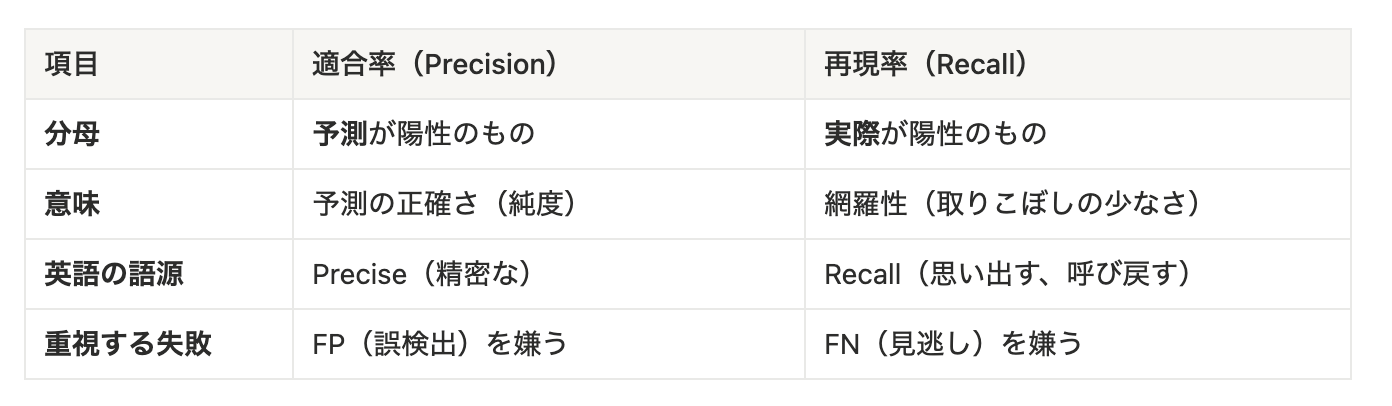 • Precision は Prediction(予測)の P → 分母は「予測陽性」