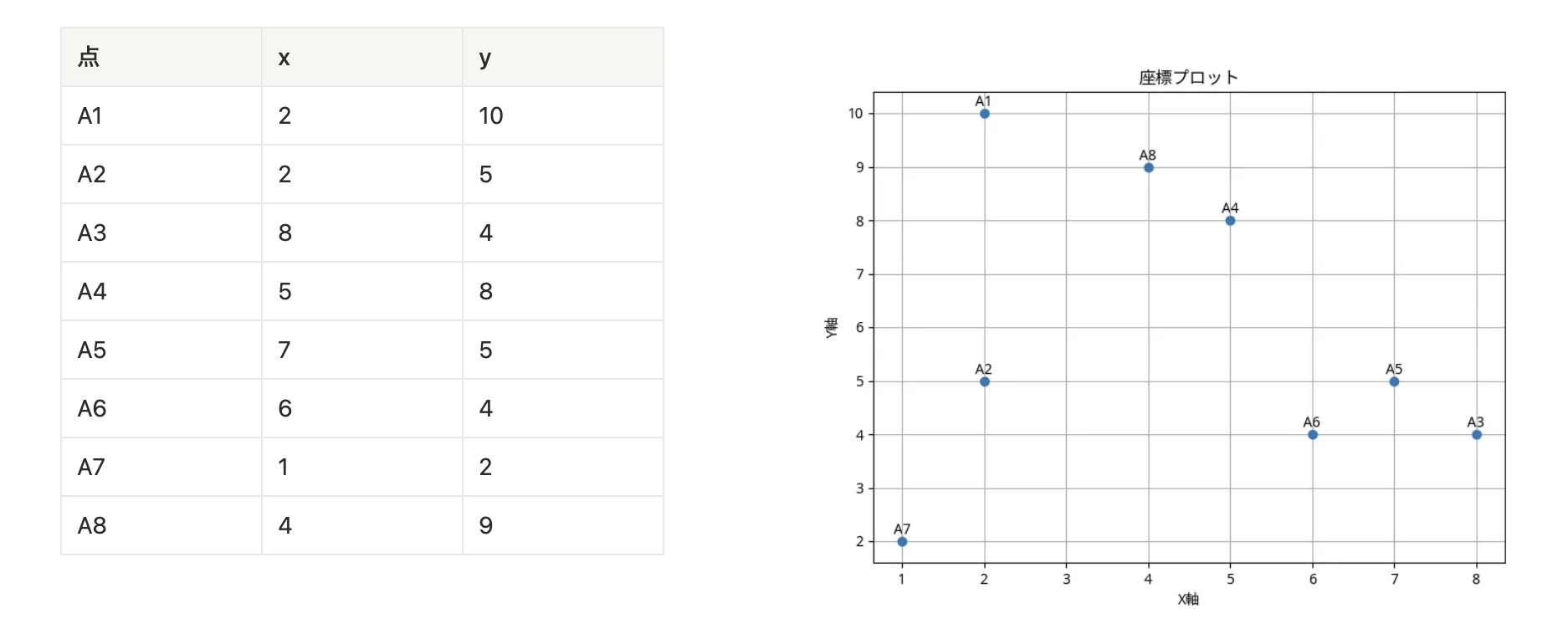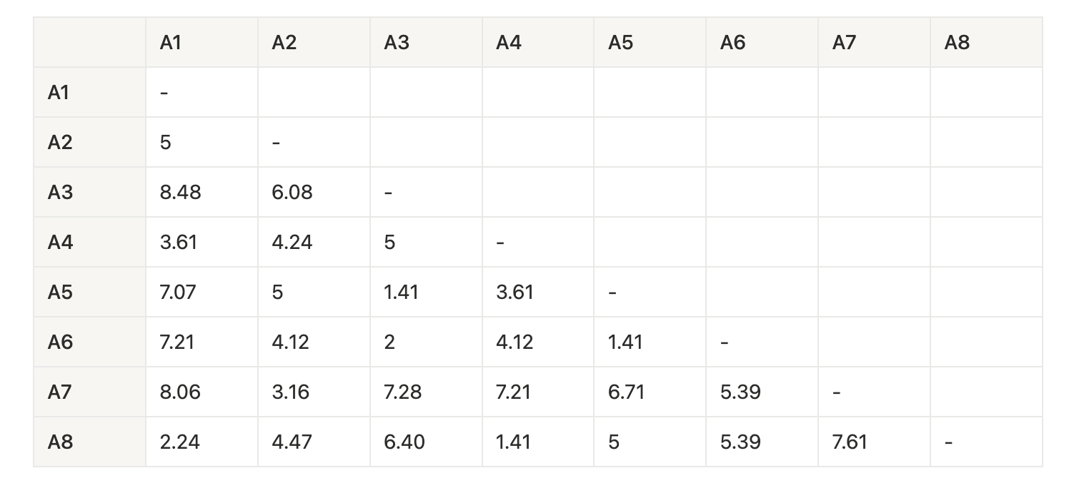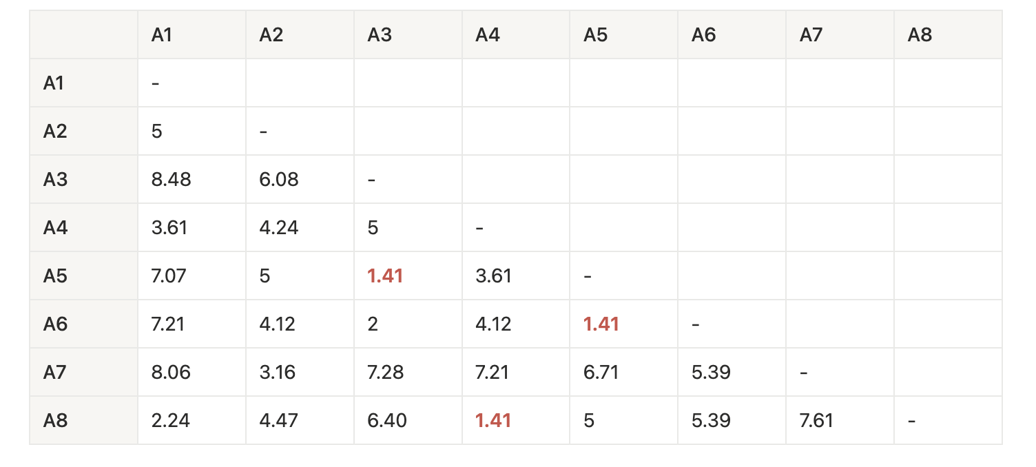 → 最小距離 1.41 のペアは複数ある(A3-A5-A6, A4-A8)