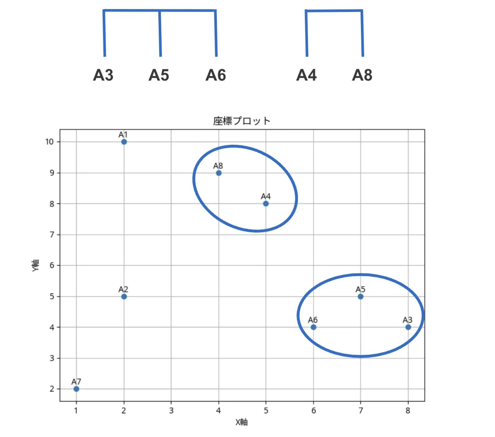 - 高さ = 4.2 → 2クラスタ({(A3-5-6), A1(A4-8)}, A2-7)