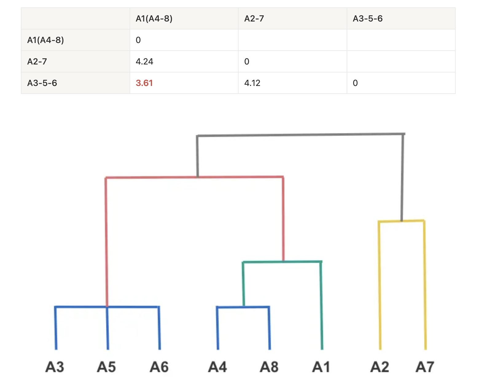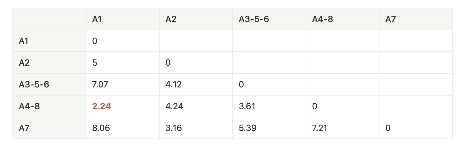 - MIN[dist({A4, A8}, {A3, A5, A6})] = min(dist({A3, A5, A6}, A4), dist({A3, A5, A6}, A8)) = min(3.605, 4.9) = 3.605