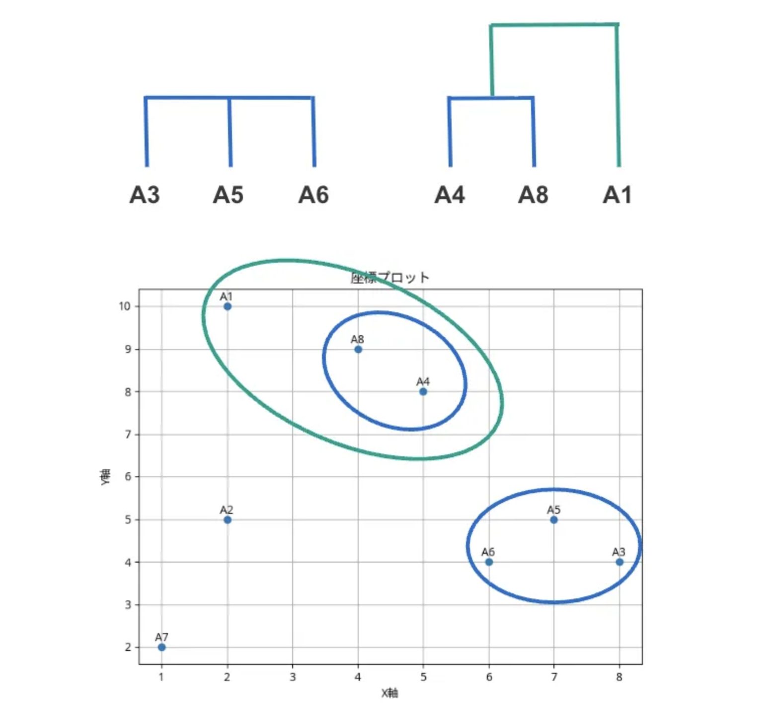 この計算例を通して、階層クラスタリングの基本的なロジックと、最短距離法がクラスター間の距離にどのように影響するかを理解いただけたかと思います。