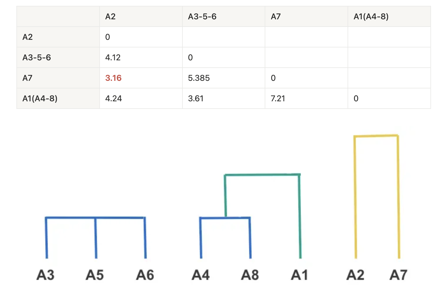- MIN[dist({A3, A5, A6}, A7)] = min(dist(A7, A3), dist(A7, A5), dist(A7, A6)) = min(7.28, 6.708, 5.385) = 5.385