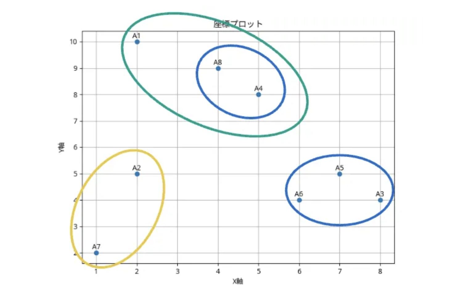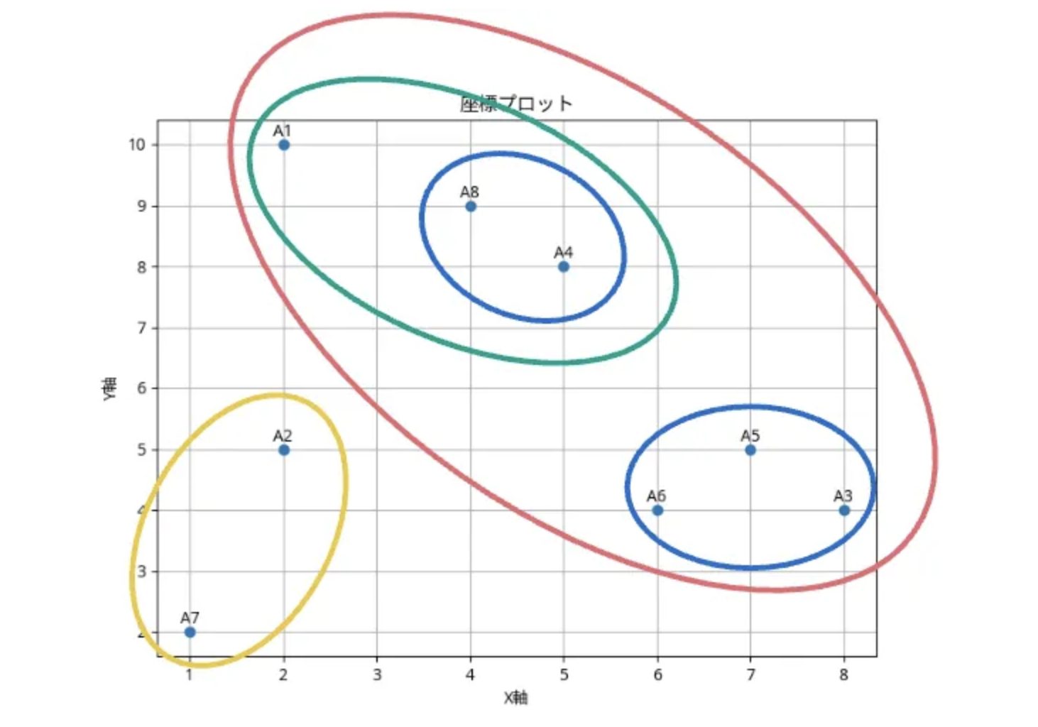 この記事では、手計算による階層クラスタリング(凝集型、最短距離法)の具体的な計算例をステップバイステップで解説しました。初期のデータポイントから距離行列を作成し、最も近いクラスターを繰り返し結合していくことで、最終的に全てのデータポイントが1つのクラスターにまとまる過程を追うことができました。